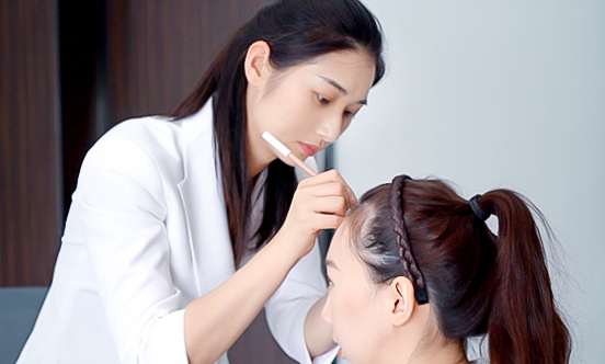 设计师会根据您的脸型、面部五官、个人气质等因素参照“三庭五眼”美学标准来设计发际线,让发际线充分修饰脸型,三庭指脸的长度比例,把脸的长度分为三个等分。五眼指脸的宽度比例,以眼形长度为单位,把脸的宽度分成五个等分,从左侧发际至右侧发际,为五只眼形。